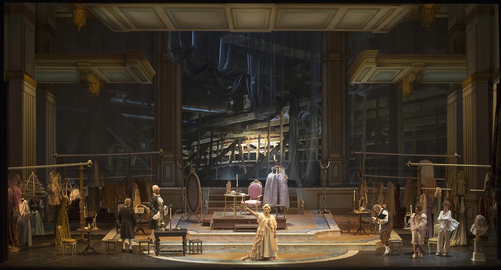 Sabrina Cirera (Adriana) en el centro de una escena del primer acto de Adriana Lecouvreur, Teatro Colón, 2017
