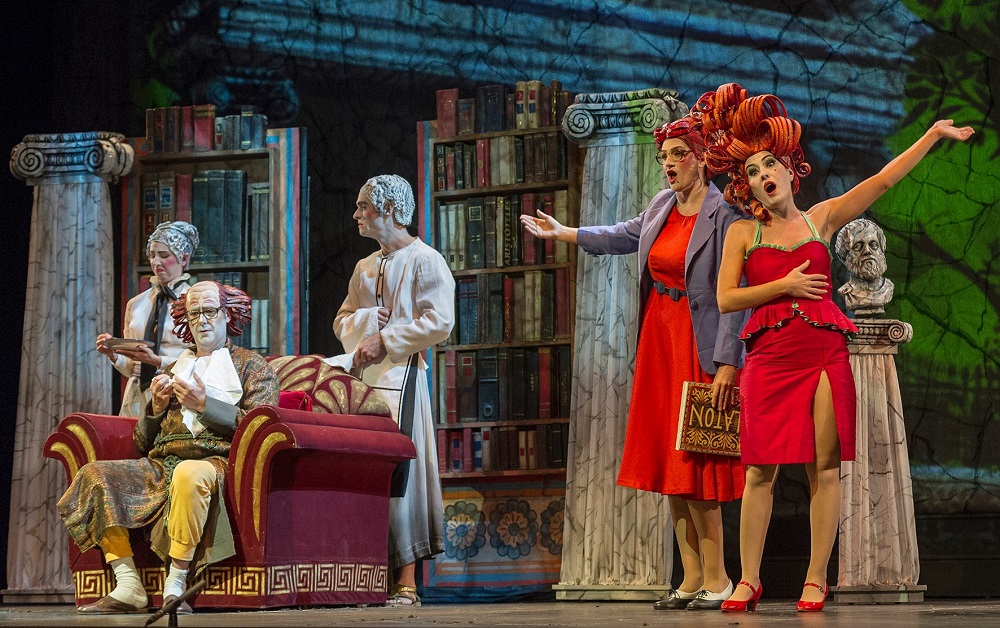 Walter Schwarz (Aristone), Trinidad Goyeneche (Ofelia) y Victoria Gaeta (Dori) en el primer acto de La grotta di Trofonio, Ópera de Cámara del Teatro Colón, Teatro 25 de Mayo, 2017