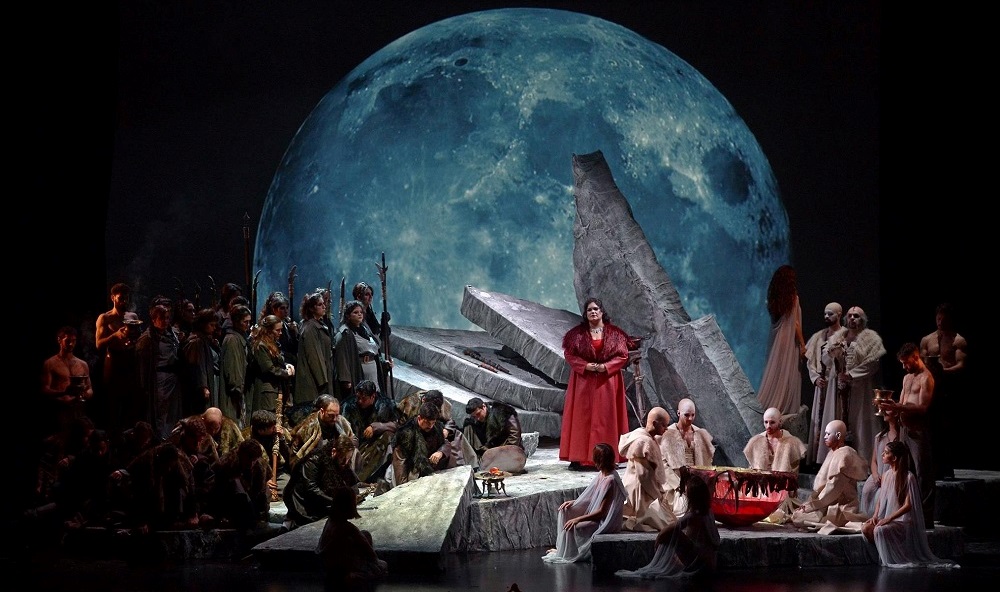 Monserrat Maldonado cantando "Casta diva", en el centro de la escena del primer acto de Norma, Juventus Lyrica, Teatro Avenida, 2017