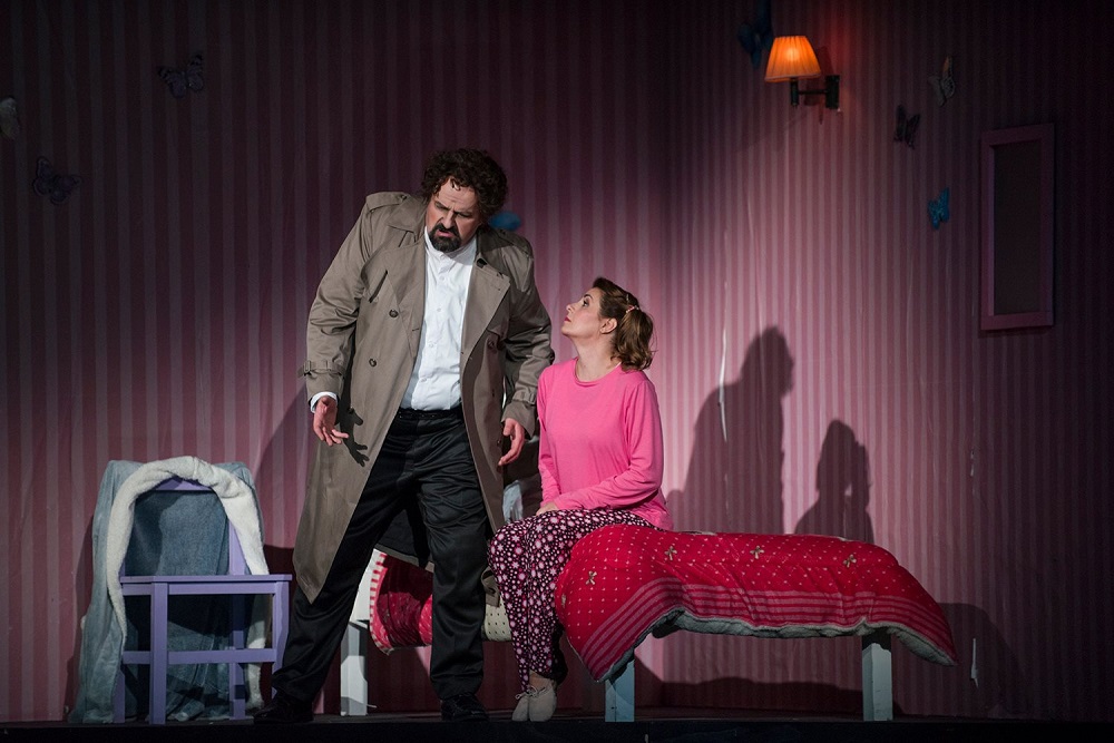Sebastian Catana (Rigoletto) y Sabina Puértolas (Gilda) en el primer acto de Rigoletto, Municipal de Santiago, 2017