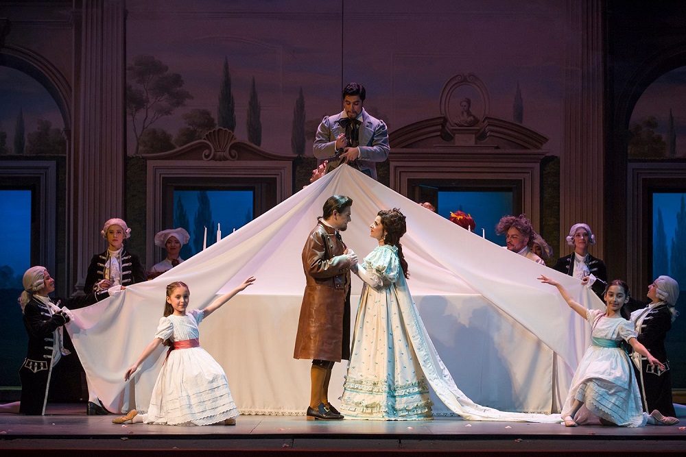 Santiago Bürgi (Ramiro) y Evelyn Ramírez (Angelina), junto a Matías Moncada (Alidoro), en el primer acto de La Cenerentola, Municipal de Santiago, Chile, 2017