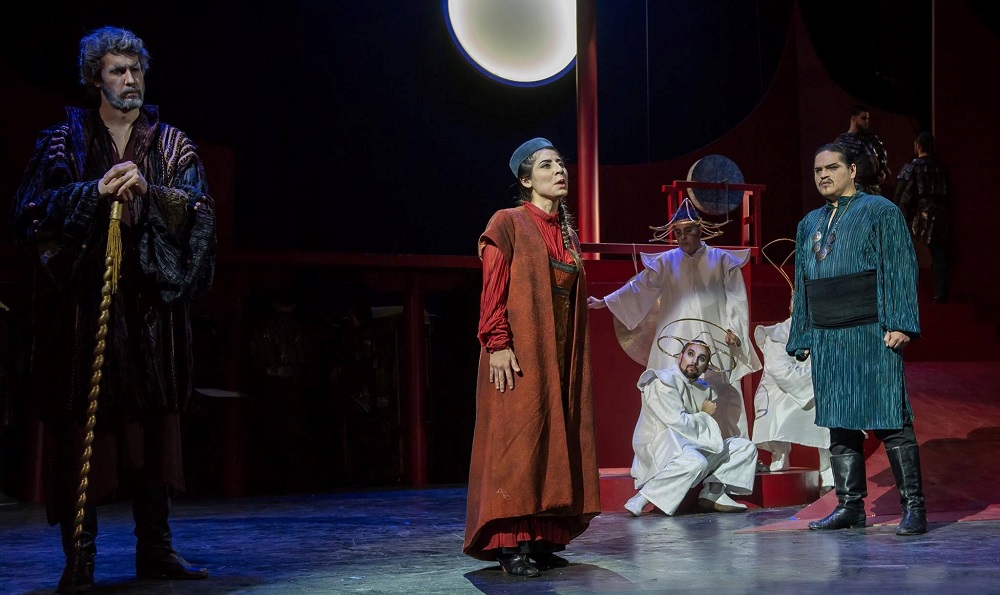 Felipe Cudina Begovic (Timur), Ivana Ledesma (Liù) y Justo Rodríguez Sánchez (Calaf) en el primer acto de Turandot, Juventus Lyrica, Teatro Avenida, 2017