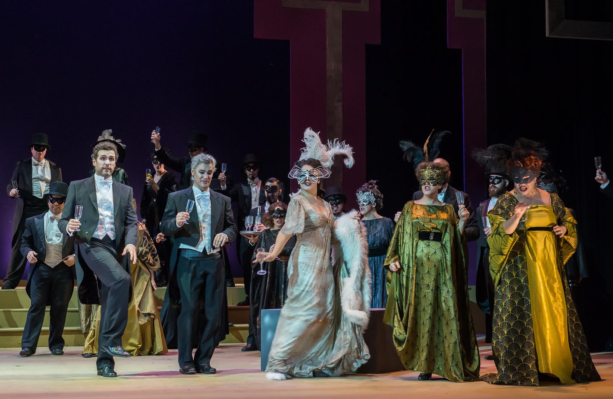 Ernesto Bauer (Falke), Mirko Thomas (Eisenstein), Laura Penchi (Adele), Lucía Alonso (Ida) y Monserrat Maldonado (Rosalinde) en el acto segundo de El murciélago, Juventus Lyrica, Teatro Avenida, 2018