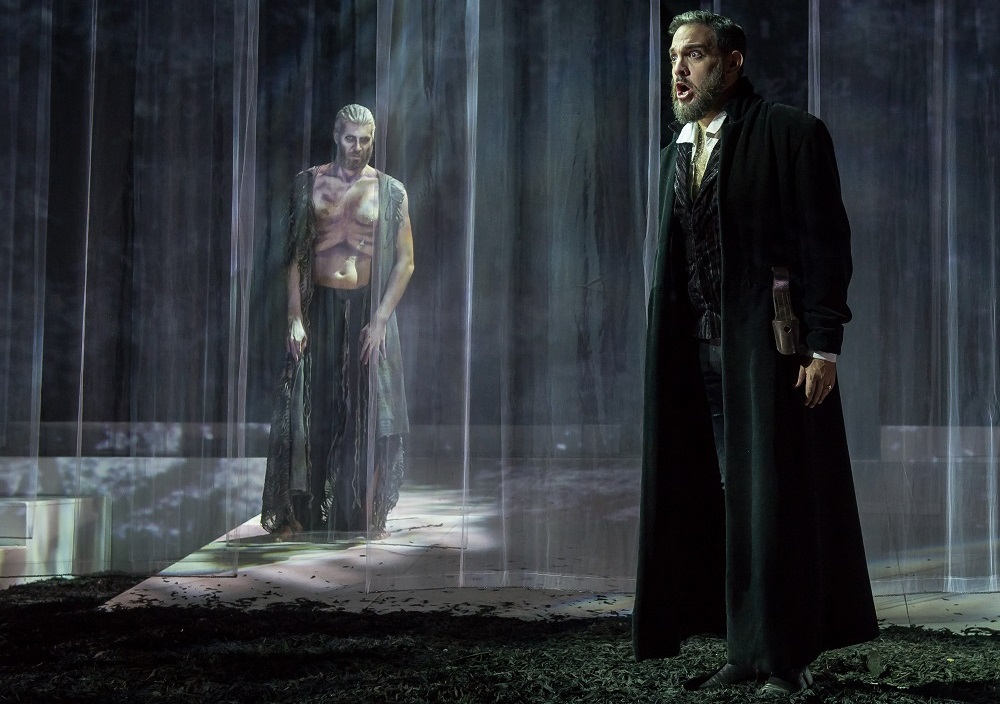 "Spectre infernal! Image vénérée!", Armando Noguera (Hamlet) y Felipe Cudina Begovic (El espectro) en la escena final del primer acto de Hamlet, Juventus Lyrica, Teatro Avenida, 2018