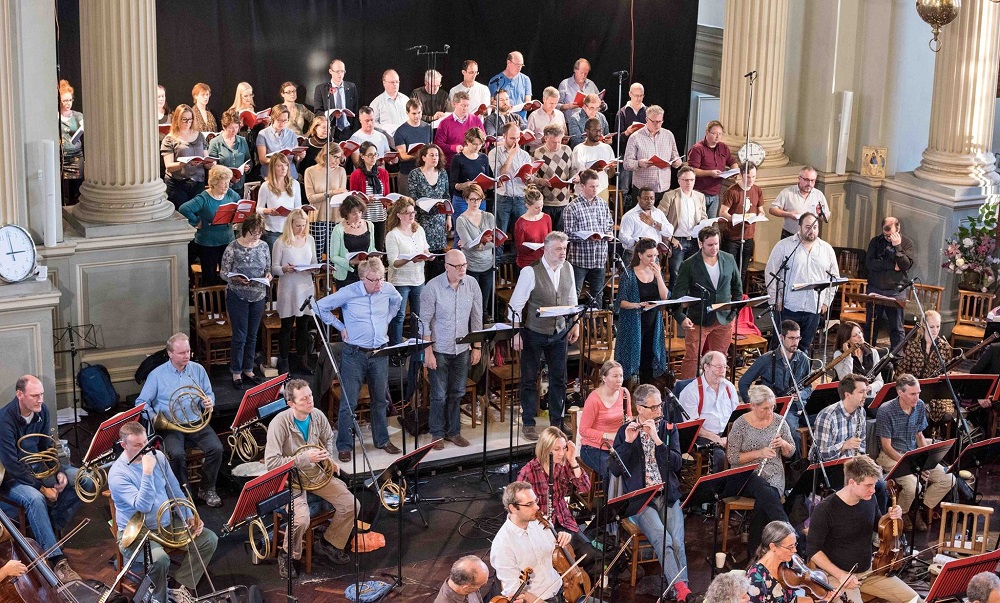 El elenco de solistas, la Orquesta de la Era de la Ilustración y el Coro Opera Rara en una de las sesiones de grabación de Les Martyrs en la Iglesia de St Clement de Londres